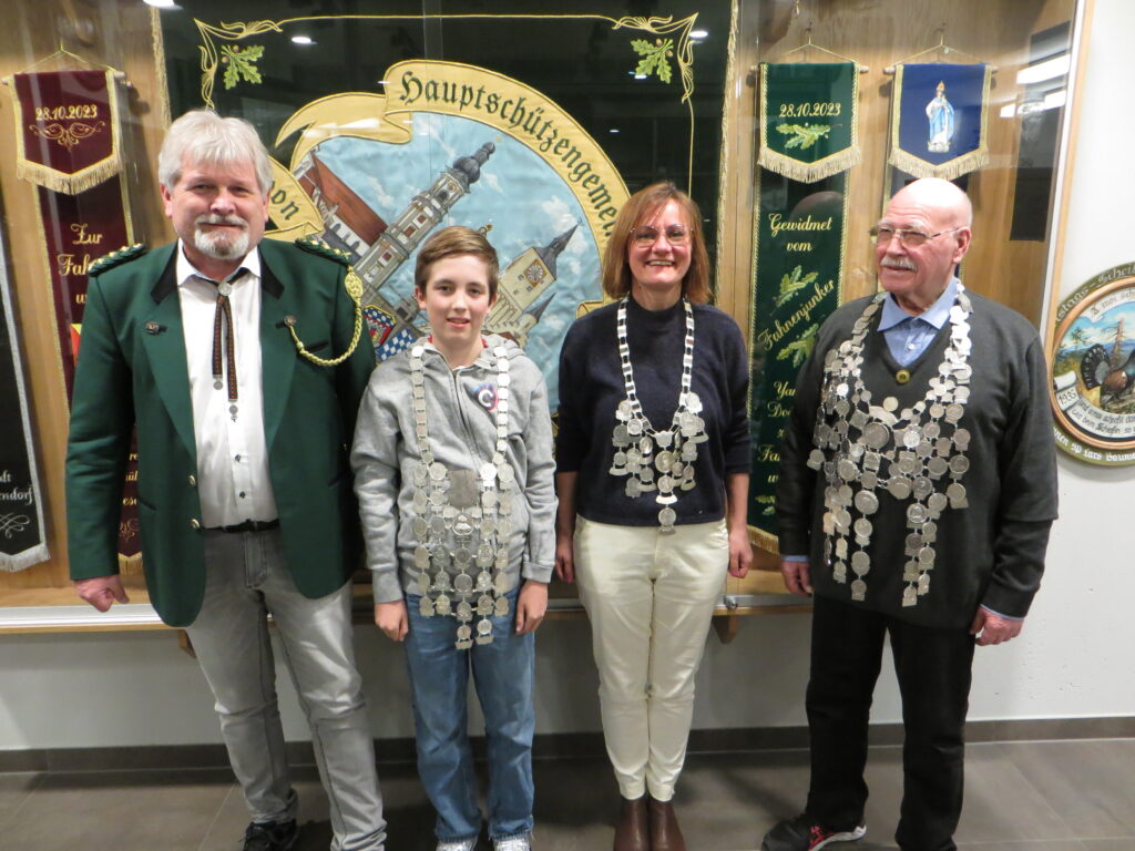 Wimschneider dankte den alten Schützenkönigen Maxime Péricat und Dmitri Volkov sowie der Damenkönigin Pia Naujokas, die ihr Amt mit Würde getragen und heute ihre Königsketten zurückgegeben haben. Er schritt dann zur Bekanntgabe der neuen Schützenkönige und legte ihnen die silbernen Königsketten um. Die neuen Majestäten sind: